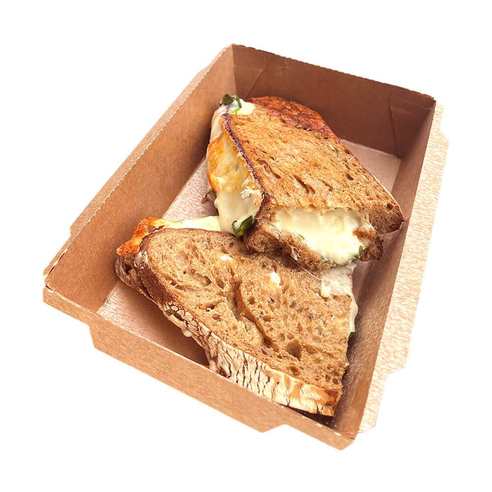 Сендвіч з крафтового хліба з сиром сулугуні, моцарелою та крем-сиром, додаємо шпинат та трюфельну олію